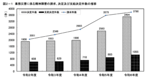 7月に公表された令和6年度「過労死等の労災補償状況」によれば、過労死等(脳・心臓疾患及び精神障害)の請求件数及び労災と認定された件数は昨年より増加、特に精神障害の労災認定件数は初めて1,000件を超え、令和2年度から増加の一途をたどっています。