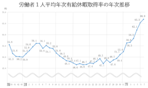 取得率上昇の要因の一つは、2019年4月から始まった有休5日取得義務でしょう。義務化された年の取得率は、56.3%と前年の52.4%から大幅に上昇しています。義務化により原則全員が有休を取得することとなり有休取得のハードルが幾分か下がり、有休取得を前提とした仕事の仕方も定着してきていることが考えられます。